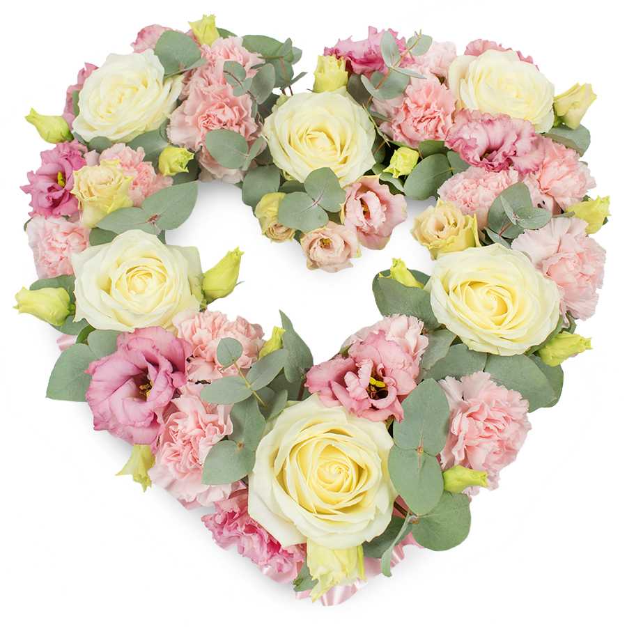 Express your love and remembrance with our Beautiful Open Heart tribute. This elegant bouquet combines white roses, pink carnations, pink lisianthus, and eucalyptus leaves into a harmonious arrangement that captivates the heart.