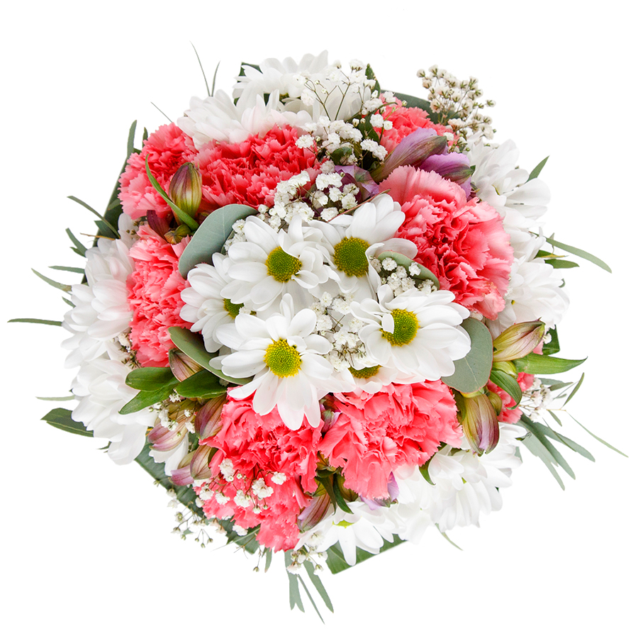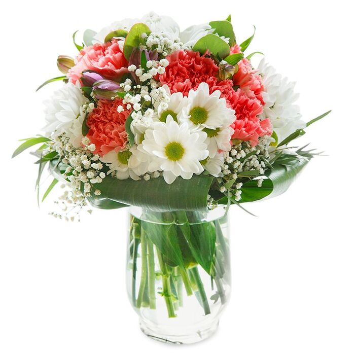 Brighten someone's day with our charming and unique flower arrangement. This exquisite bouquet combines snow-white chrysanthemums, delicate gypsophila, soft light pink carnations, and vibrant aspidistra leaves for a stunning display.
